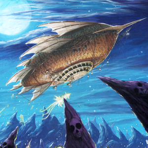 Ghostly vampire squid, jellyfish, and other deep-sea denizens swim through the air, fading away into the distant stars.