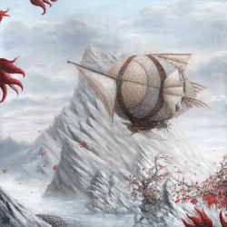 The airship is set against a calm and cloudy sky, and white stone mountains. In the mid ground, blow blossoms from the foreground trees, and tentacles subtly hidden within the flowers, trees, mist and fog.