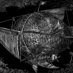 This is the first engraving in the strange-fiction steampunk art series “Airships and Tentacles” wherein the works of, concepts of, and influences from Jules Verne and H.P. Lovecraft intermingle.