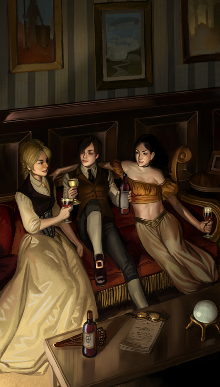 Here, we have three very different women (yes, the one in the middle is a woman!) with different pasts (represented by the pictures behind them) and different aspirations (represented by their belongings on the table). Yet here, in this moment, they have a connection and can appreciate and celebrate themselves and their friendship. I think the Steampunk world is nicely represented here with the society woman, the adventurer, and the mystic. One of the things I love about Steampunk is its diversity.
